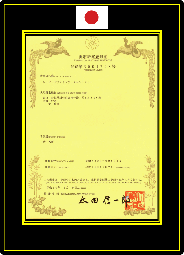 | ■龙臣印刷科技所研发之″雷射列印加黑机″已获德国,韩国,中国,香港等地之专利,并在其他20国申办中。目前正向全世界拓展行销,颇受标签,丝网及包装印刷制版业者之欢迎。